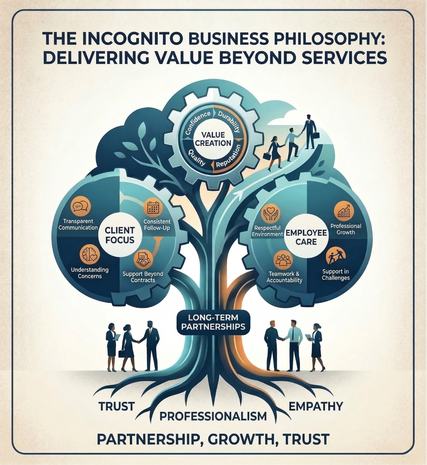 At Incognito, we believe our role goes beyond simply delivering services. Our philosophy is centered around creating value, building trust, and developing long-term relationships with both clients and employees.