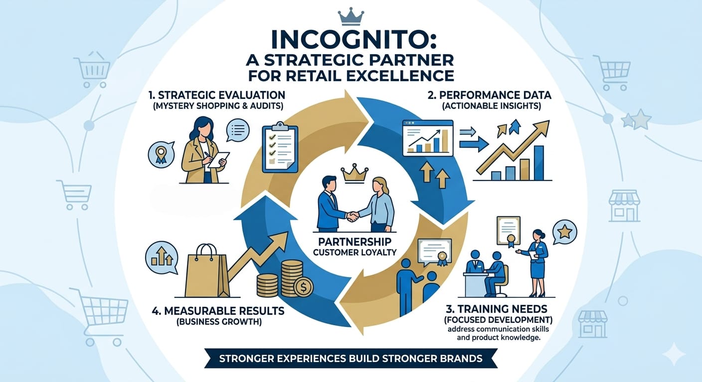 Incognito conducts professional mystery shopping audits where trained evaluators visit stores as normal customers and assess: